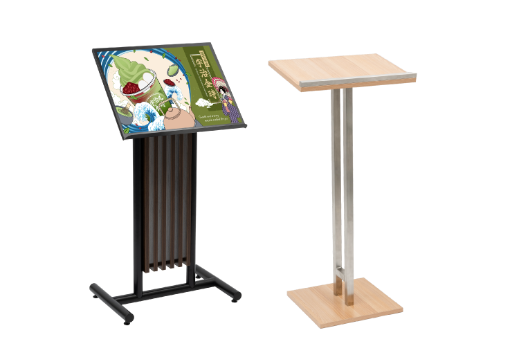 メニュースタンドは飲食店の店頭に設置して、ボードにメニューの掲示や受付記名などに使用されます。ボードはメニューやペンなどの落下防止ストッパー付きで、見やすい目線の傾斜タイプやLEDライト付きタイプ。スタンドは据え置き式、キャスター移動式、三脚式、折りたたみ式、収納ラック付き、和風化粧パネルなどのタイプがあり、店舗、公共施設、ホテルロビー、催事場、展示会など、用途に合わせて様々な場所で活用できます。