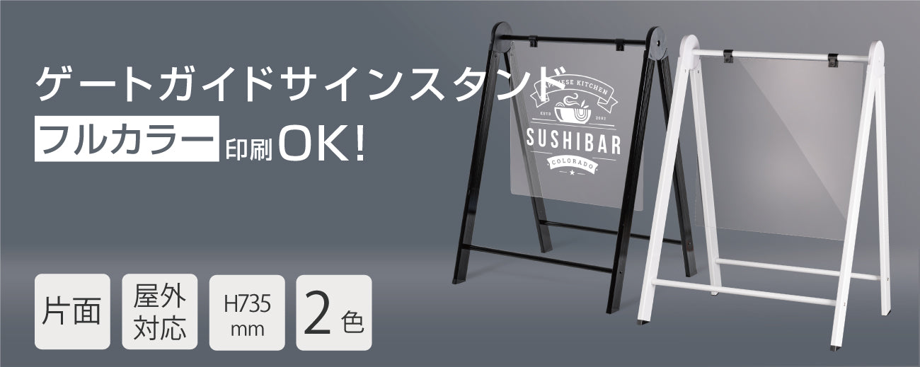 一般的なA型看板が「Aの字型」になるように表示面が2枚あるのに対し、ゲートガイドサインは上部から1枚の表示面がぶら下がっている形状が特徴的なシンプルでデザイン性に優れたスタンド看板です。